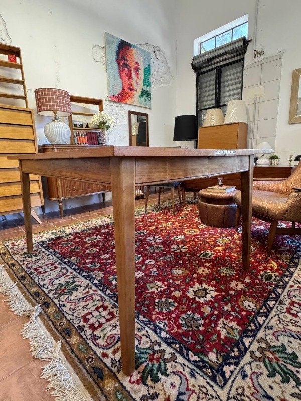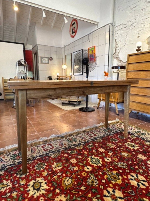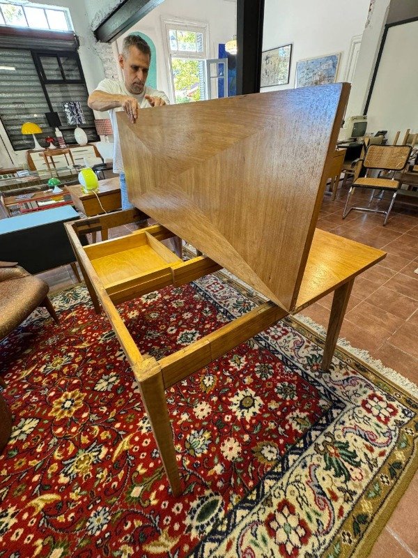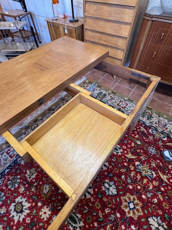 Mesa libro con detalles de marquetería. Tiene un práctico sistema de extensión. Tambien un espacio de guardado debajo de la tapa.