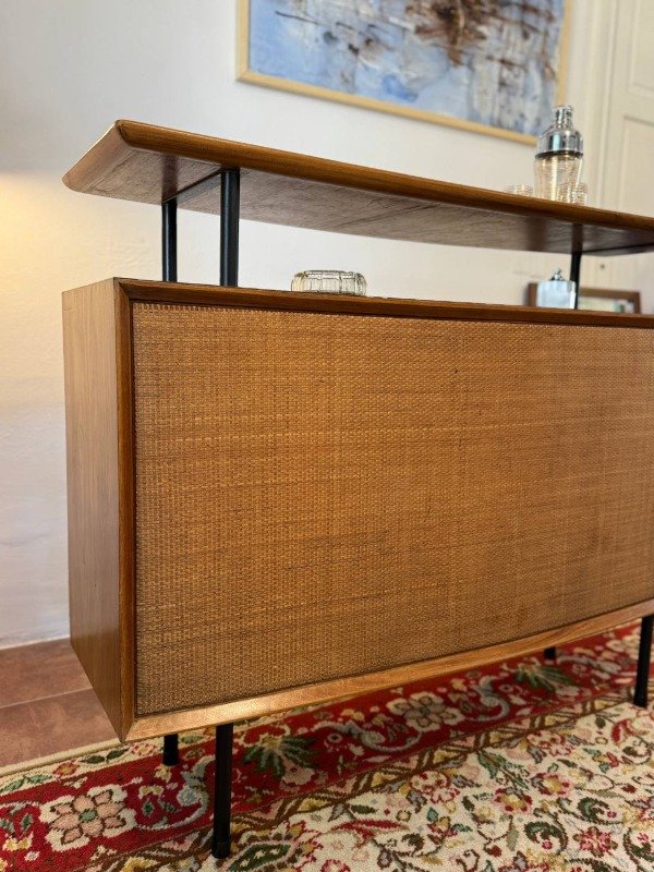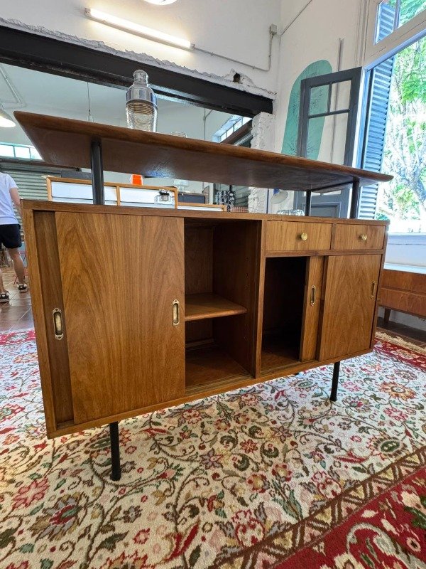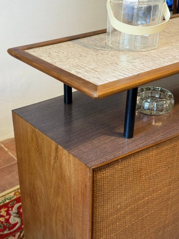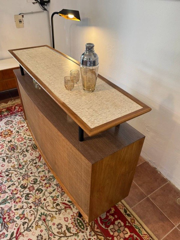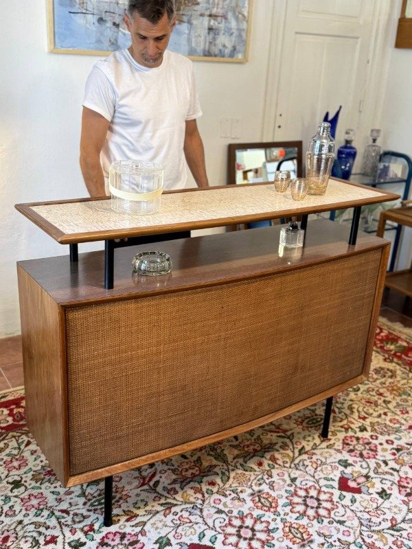 Barra vintage restaurada. El frente tiene un revestimiento de esterilla. Las tapas de arriba son de fórmica. Luego el contrafrente y laterales del mueble son de madera que se lavó y laqueó (satinado).