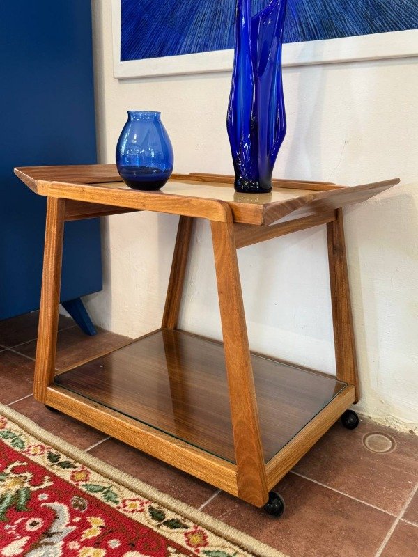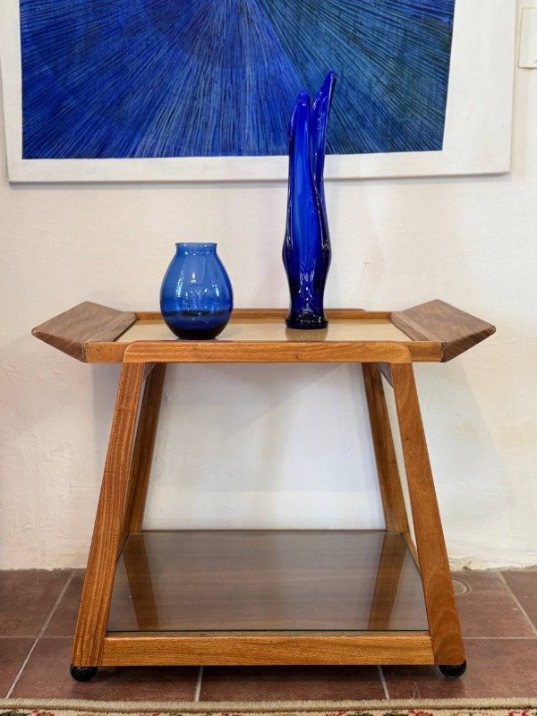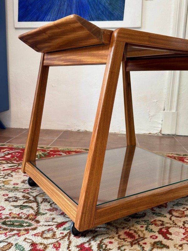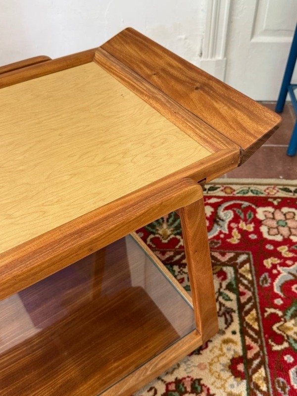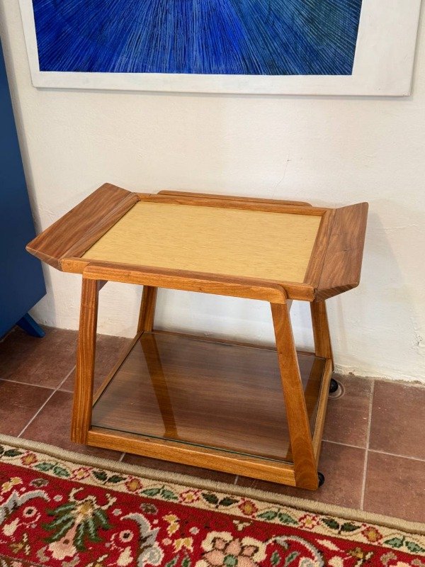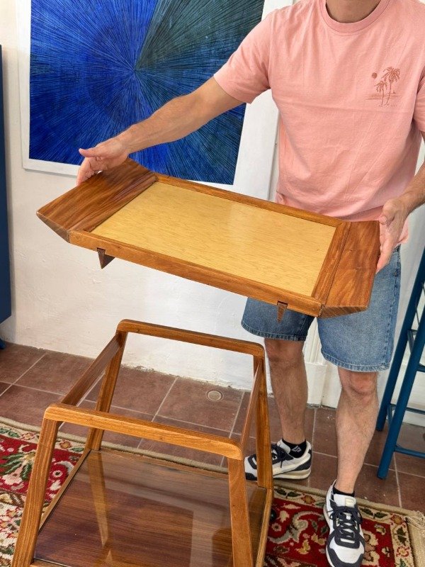 Carrobar vintage restaurado. Bandeja extraible con tapa de fórmica beige.