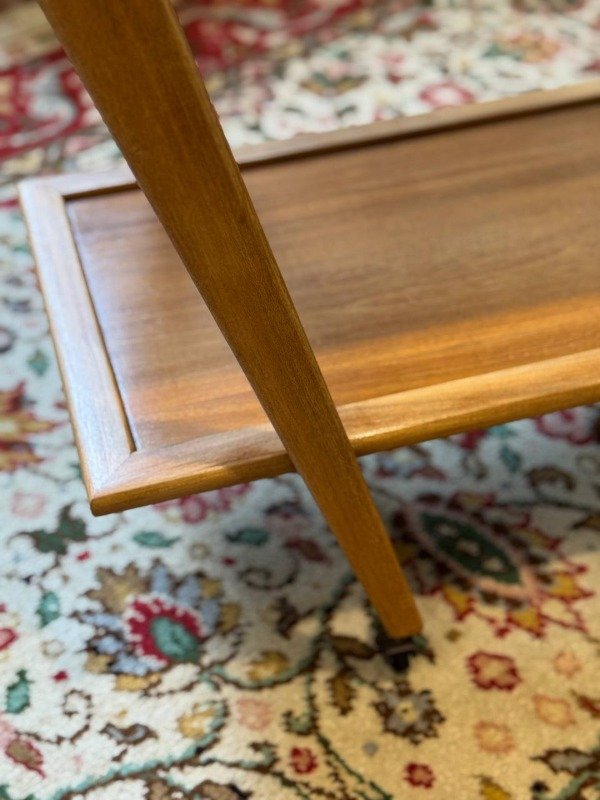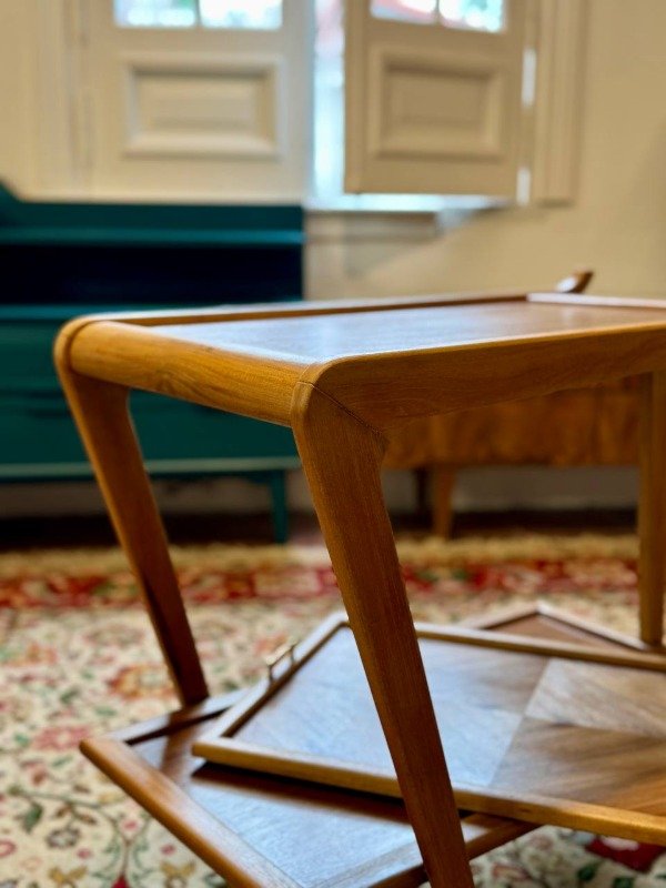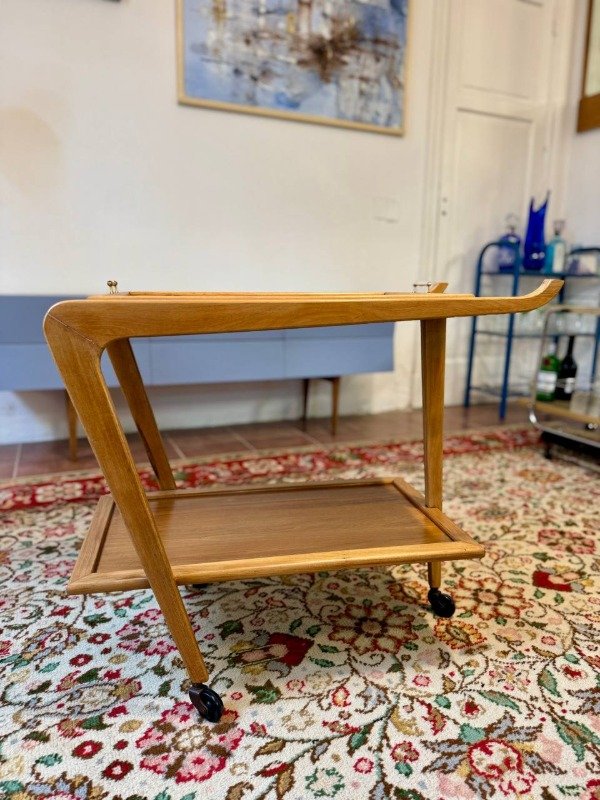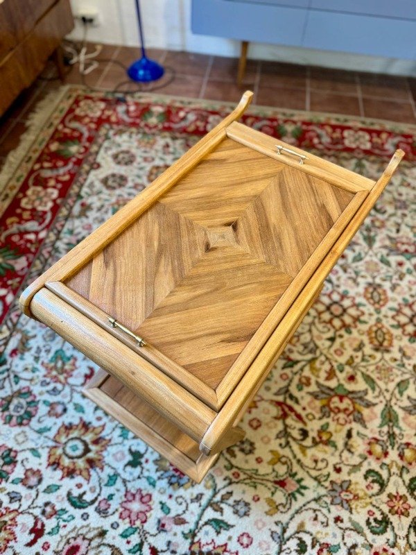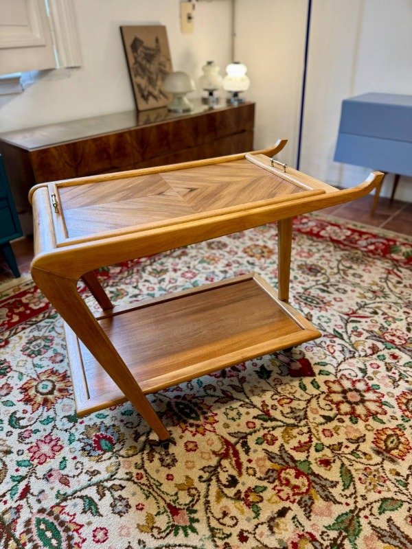Carrobar midcentury restaurado. Tiene una bandeja extraible, con detalle de marquetería.