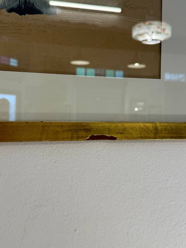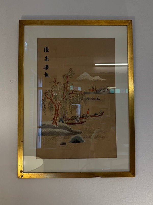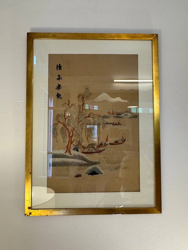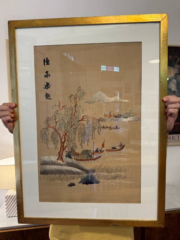La obra está bordada a mano con hilos de seda sobre tela. Marco original. Se colocó paspartu nuevo.